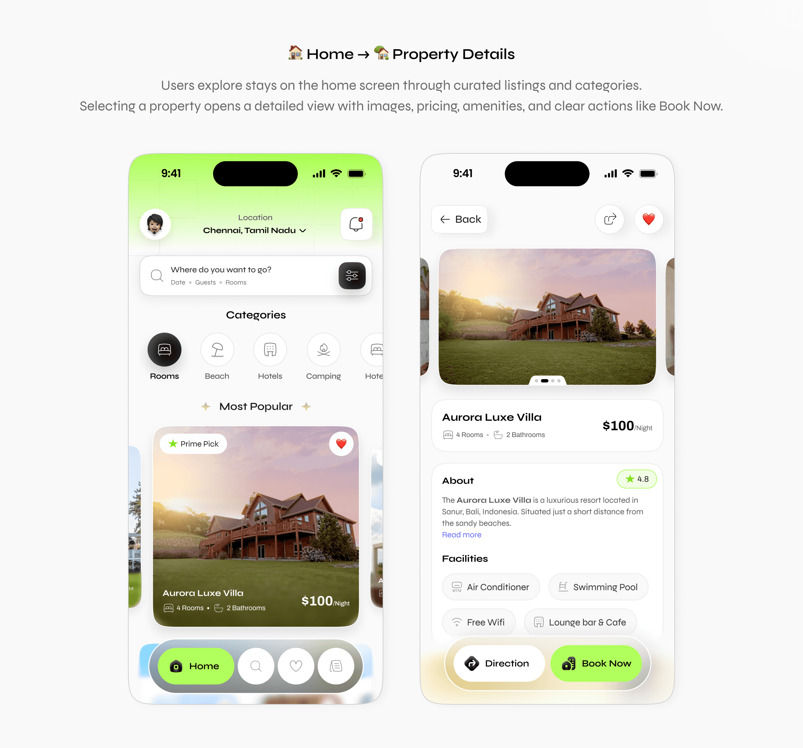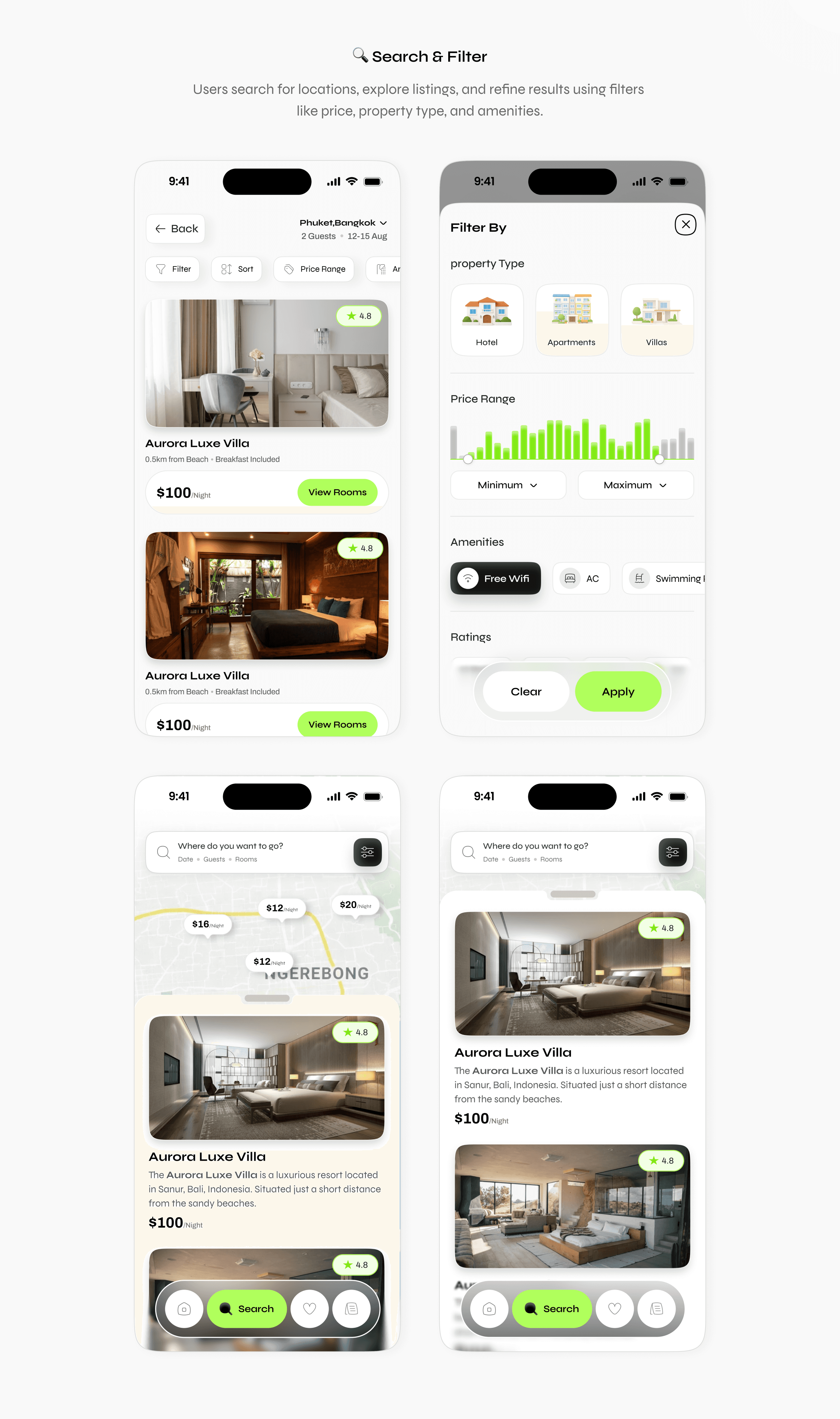 The design focuses on improving search, property exploration, and booking flow through a structured layout and intuitive interactions. Card-based components, smart filters, and a step-by-step booking process help users easily compare options and make confident decisions.