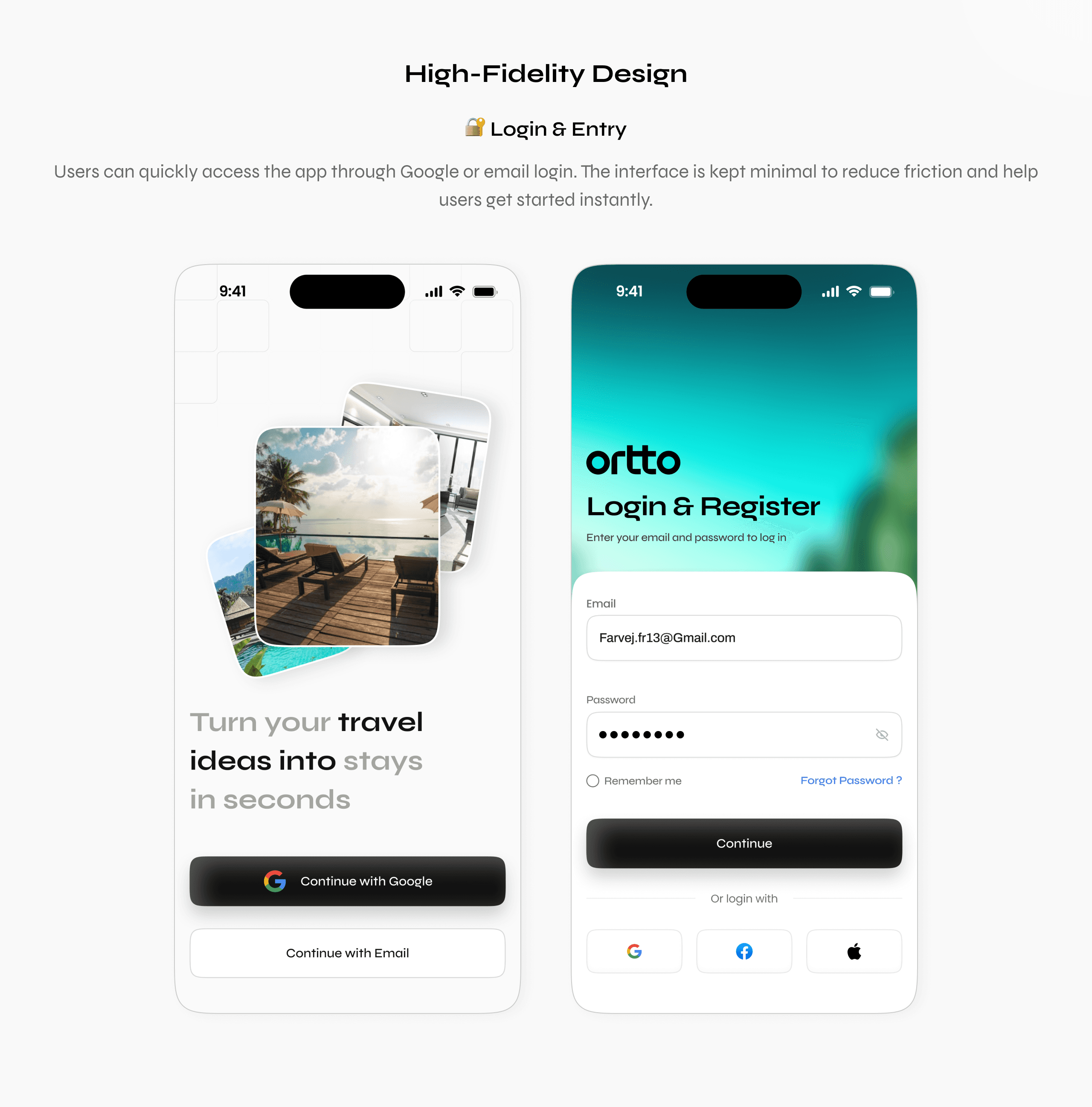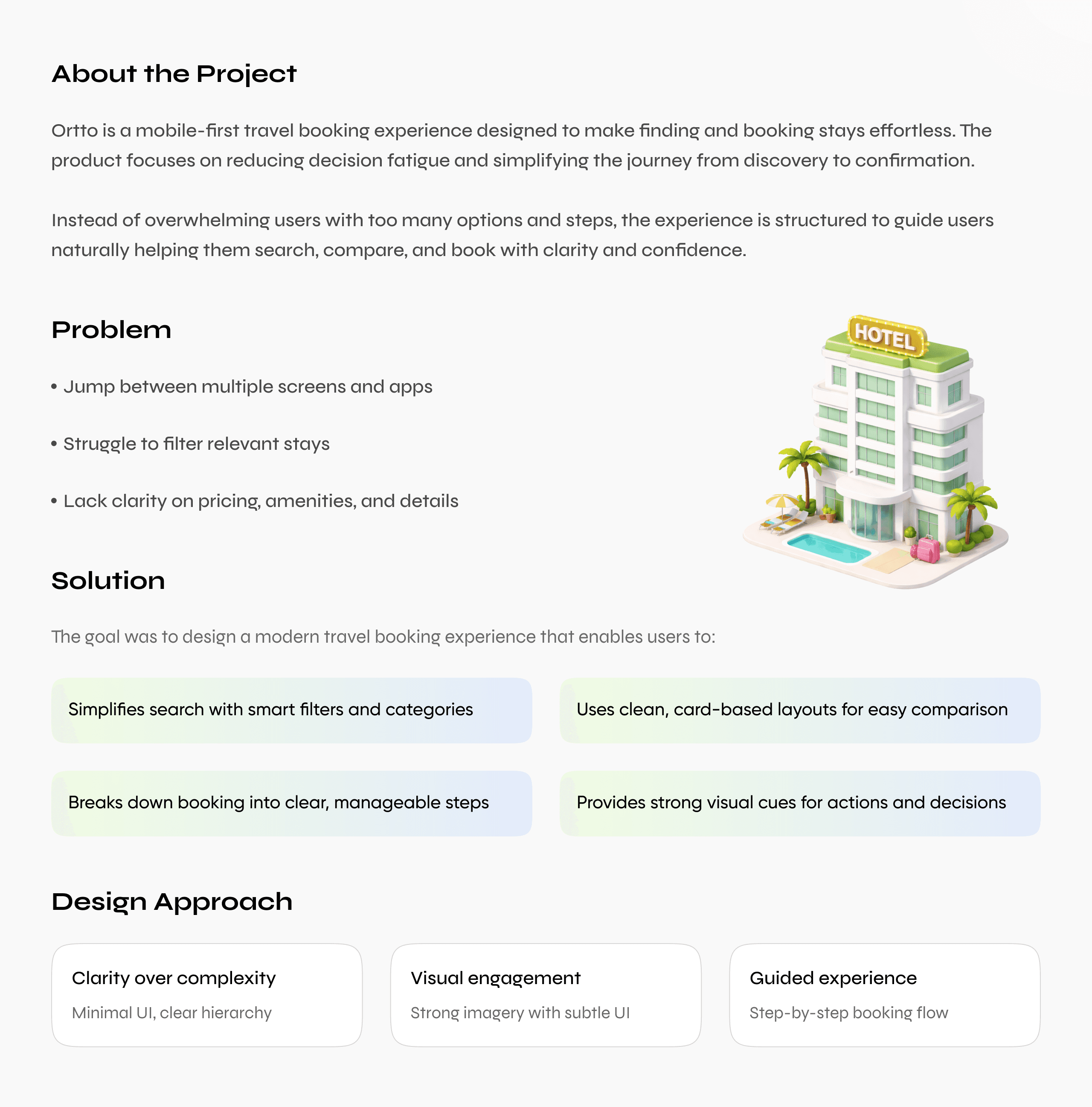 Designed a modern travel booking mobile application that enables users to discover stays, explore properties, and complete bookings through a seamless experience. The goal of the project was to simplify the journey from discovery to confirmation while reducing user effort and decision fatigue.