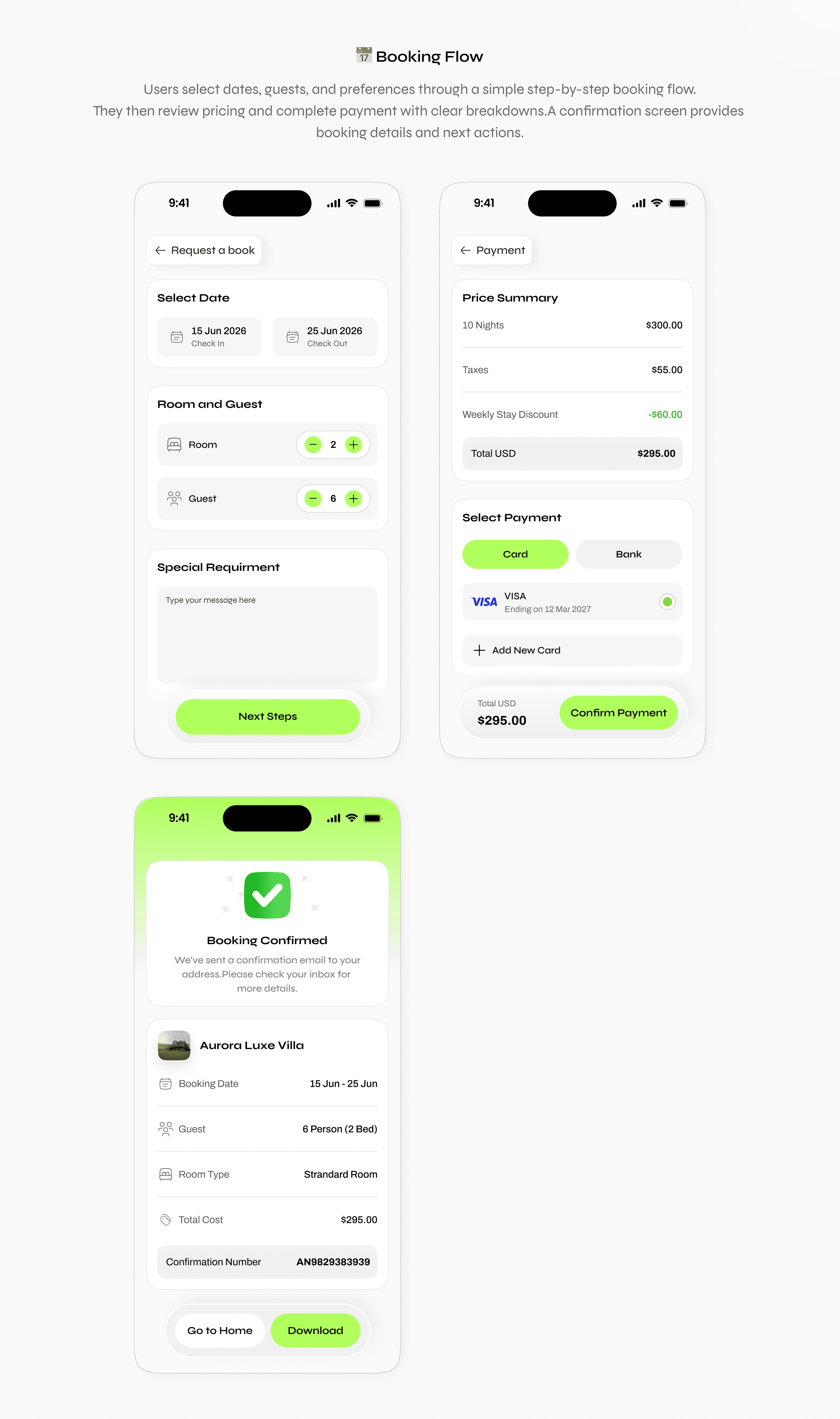 The interface emphasizes clarity, strong visual hierarchy, and a minimal design approach to create a smooth and engaging user experience across all stages from browsing to final confirmation.